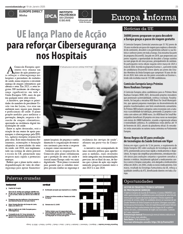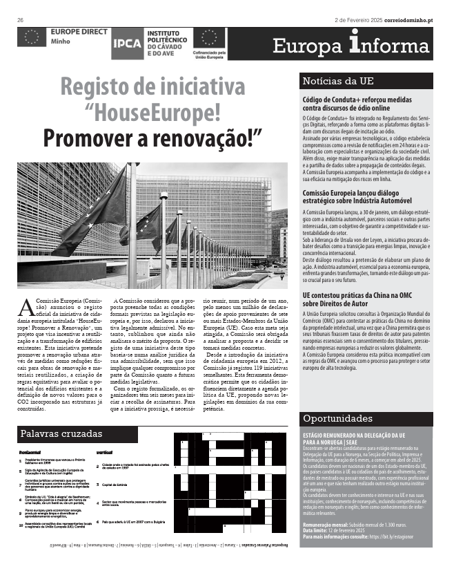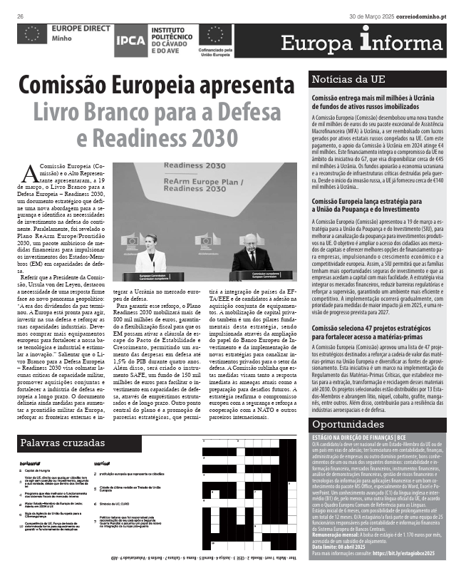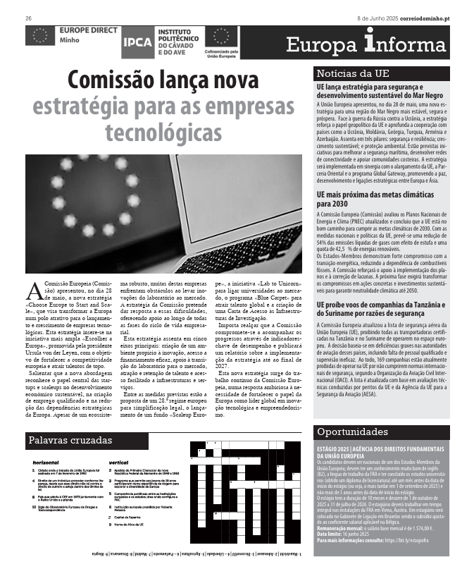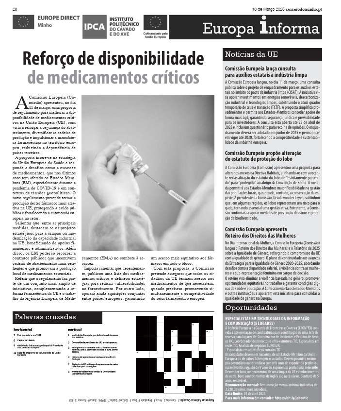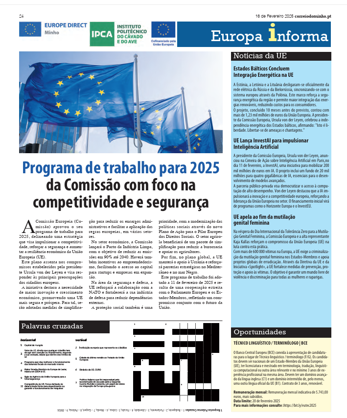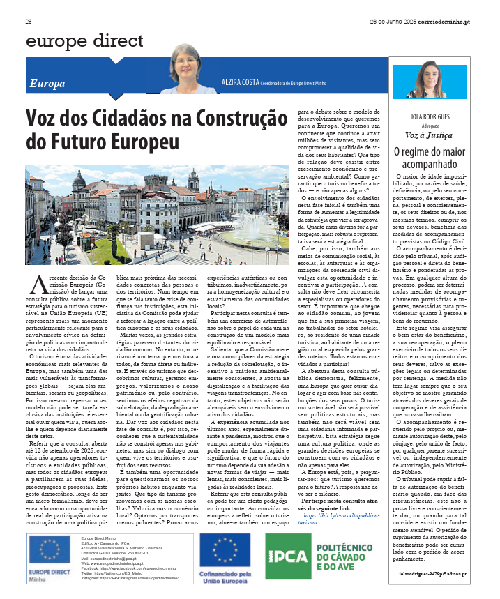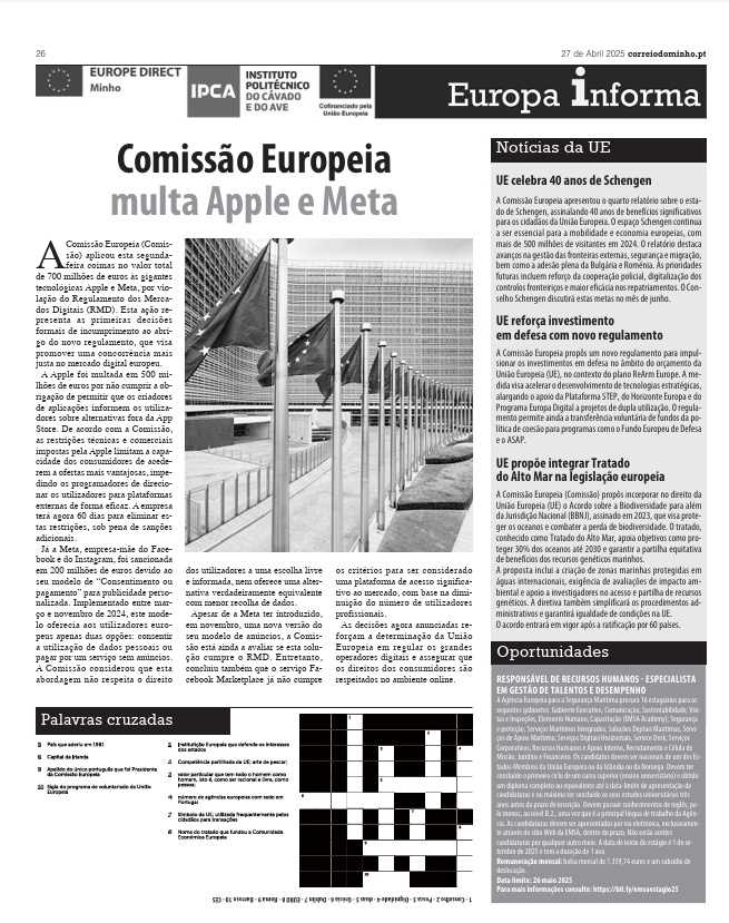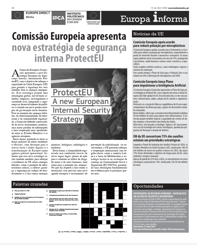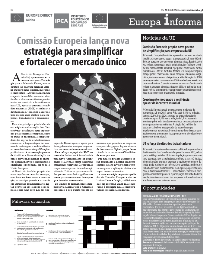 Assim, o Europe Direct Minho tem vindo a publicar no Jornal Correio do Minho, com periodicidade regular, uma página de informação sobre assuntos europeus.